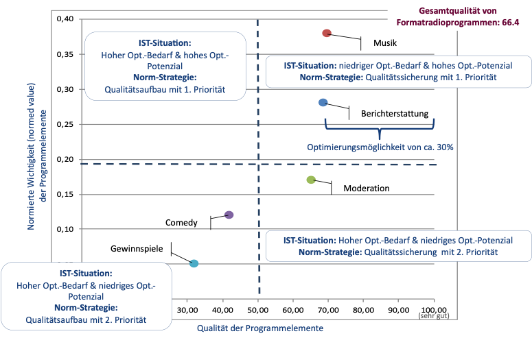 In dieser Publikation wird auf der Basis einer empirischen Untersuchung herausgearbeitet, welche Relevanz die einzelnen Programmelemente und Programmeigenschaften für Radiohörer haben. Ferner wird untersucht, wie gut die Programmelemente und Programmeigenschaften von den Hörern bewertet werden, so dass Optimierungsansätze für Radiosender abgeleitet werden können.
